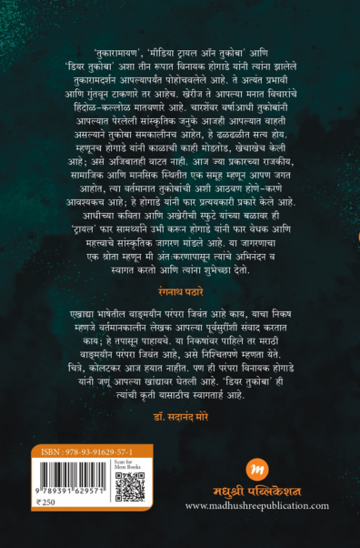 ‘तुकारामायण’, ‘मीडिया ट्रायल ऑन तुकोबा’ आणि ‘डियर तुकोबा’ अशा तीन रुपात विनायक होगाडे यांनी त्यांना झालेले तुकारामदर्शन आपल्यापर्यंत पोहोचविलेले आहे. ते अत्यंत प्रभावी आणि गुंतवून टाकणारे तर आहेच, खेरीज ते आपल्या मनात विचारांचे हिंदोळ-कल्लोळ मातविणारे आहे. चारशेंवर वर्षांआधी तुकोबांनी आपल्यात पेरलेली सांस्कृतिक जनुके आजही आपल्यात वाहती असल्याने तुकोबा समकालीनचआहेत, हे ढळढळीत सत्य होय. म्हणून होगाडे यांनी काळाची काही मोडतोड, खेचाखेच केली आहे असे अजिबातही वाटत नाही. आज ज्या प्रकारच्या राजकीय, सामाजिक आणि मानसिक स्थितीत एक समूह म्हणून आपण जगत आहोत, त्या वर्तमानात तुकोबांची अशी आठवण होणे, करणे आवश्यकच आहे, हे होगाडे यांनी फार प्रत्ययकारी प्रकारे केले आहे.