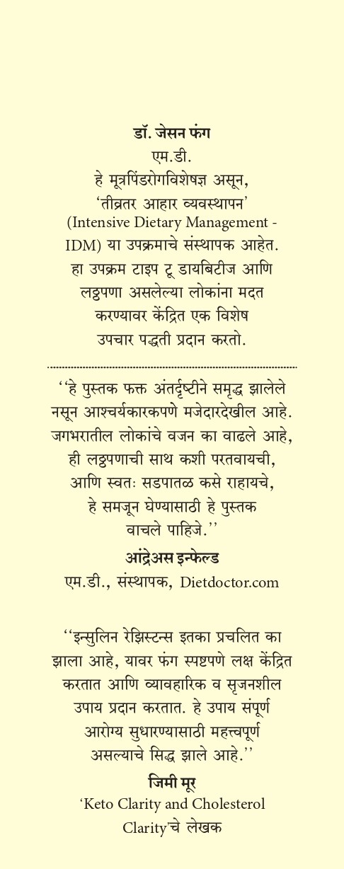या अत्यंत वाचनीय आणि प्रेरक पुस्तकात डॉ. जेसन फंग लठ्ठपणाचा मूलगामी व सबल सिद्धान्त मांडतात. हा सिद्धान्त योग्य पोषण आहाराबद्दल धक्कादायक अंतर्दृष्टी प्रदान करतो. याबाबतच्या पाच मूलभूत पायऱ्यांसह आयुष्यभरच्या सवयींचे सूत्र यांच्या साहाय्याने तुमचे आरोग्य सुधारेल आणि तुमच्या शरीरातील इन्सुलिनची पातळीही नियंत्रित होईल. उत्तम आरोग्यासाठी, निरोगी वजन प्राप्त करण्यासाठी, आंतरखंडित उपवासाचा (इंटरमिटंट फास्टिंग) उपयोग करून इन्सुलिन रेझिस्टन्सचे चक्र कसे मोडायचे याची उकलदेखील डॉ. फंग करतात