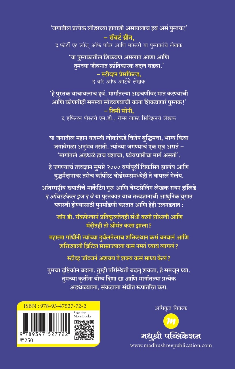 या जगातील महान यशस्वी लोकांकडे विशेष बुद्धिमत्ता, भाग्य किंवा जगावेगळा अनुभव नसतो. त्यांच्या जगण्याचं एक सूत्र असतं -‘मार्गातले अडथळे हाच यशाचा, ध्येयप्राप्तीचा मार्ग असतो’. हे जगण्याचं तत्त्वज्ञान सुमारे २००० वर्षांपूर्वी विकसित झालंय आणि युद्धमैदानावर तसेच कॉपोरेट बोर्डरूम्समध्येही ते वापरलं गेलंय. आंतरराष्ट्रीय ख्यातीचे मार्केटिंग गुरू आणि बेस्टसेलिंग लेखक रायन हॉलिडे द ऑबस्टॅकल इज द वे या पुस्तकात याच तत्त्वज्ञानाची आधुनिक युगात यशस्वी होण्यासाठी पुनर्मांडणी करतात आणि हेही उलगडतात :